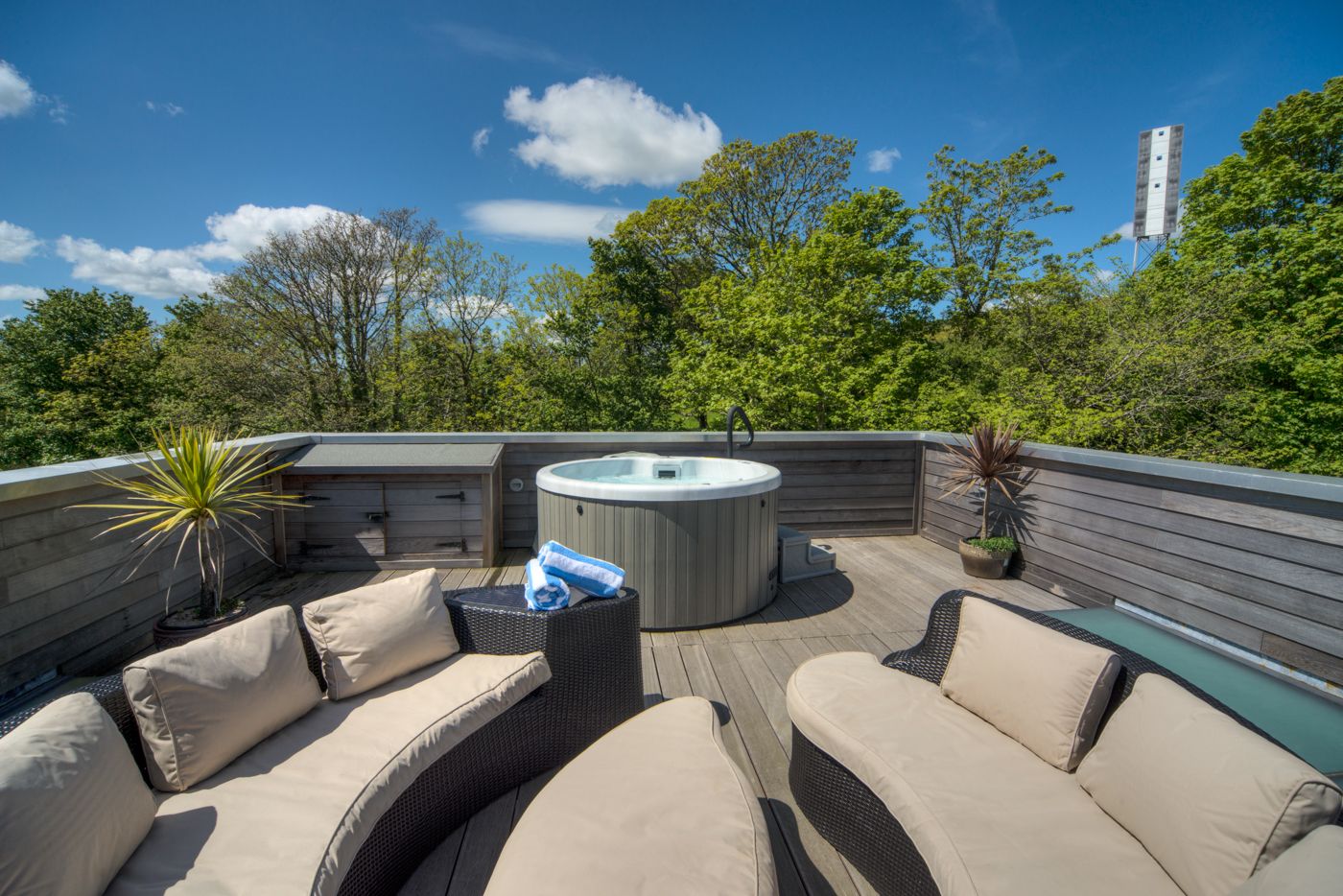 Outdoor hot tub on a balcony with seating and a view of modern houses and trees under a blue sky.