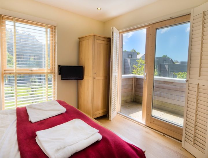 Bright bedroom with a double bed, red blanket, wardrobe, flat screen TV, and French doors opening to a small balcony.