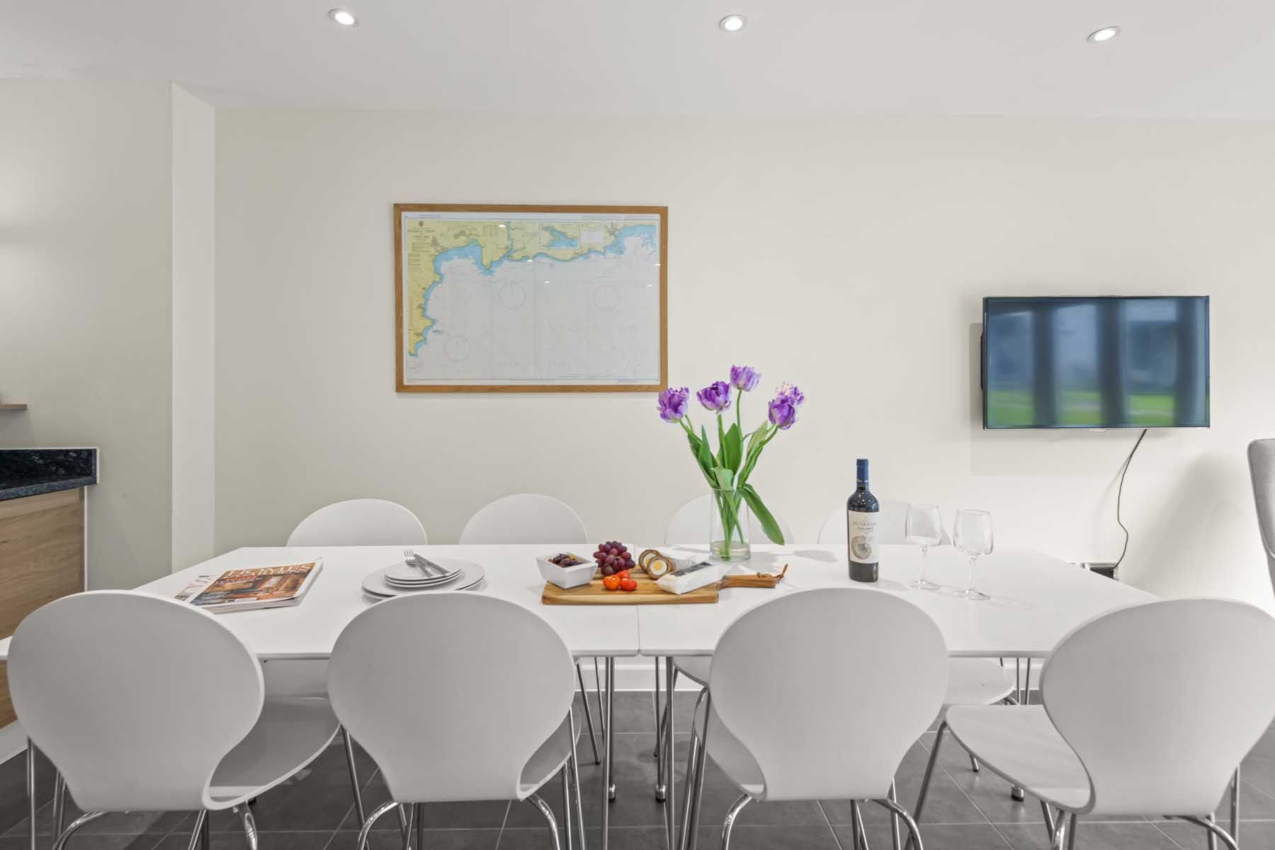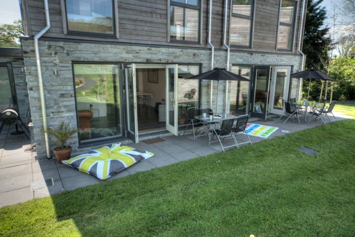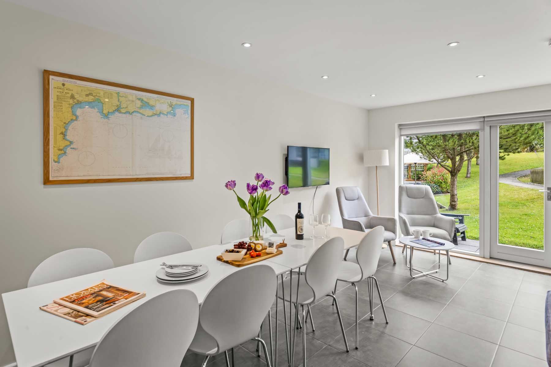 The open-plan ground floor includes a spacious kitchen, living, and dining area, featuring NEFF appliances and extensive patios with south-easterly views. Entertainment options abound with WiFi, a 40-inch 3D Freeview HD Smart Television, and an additional TV in the main bedroom.