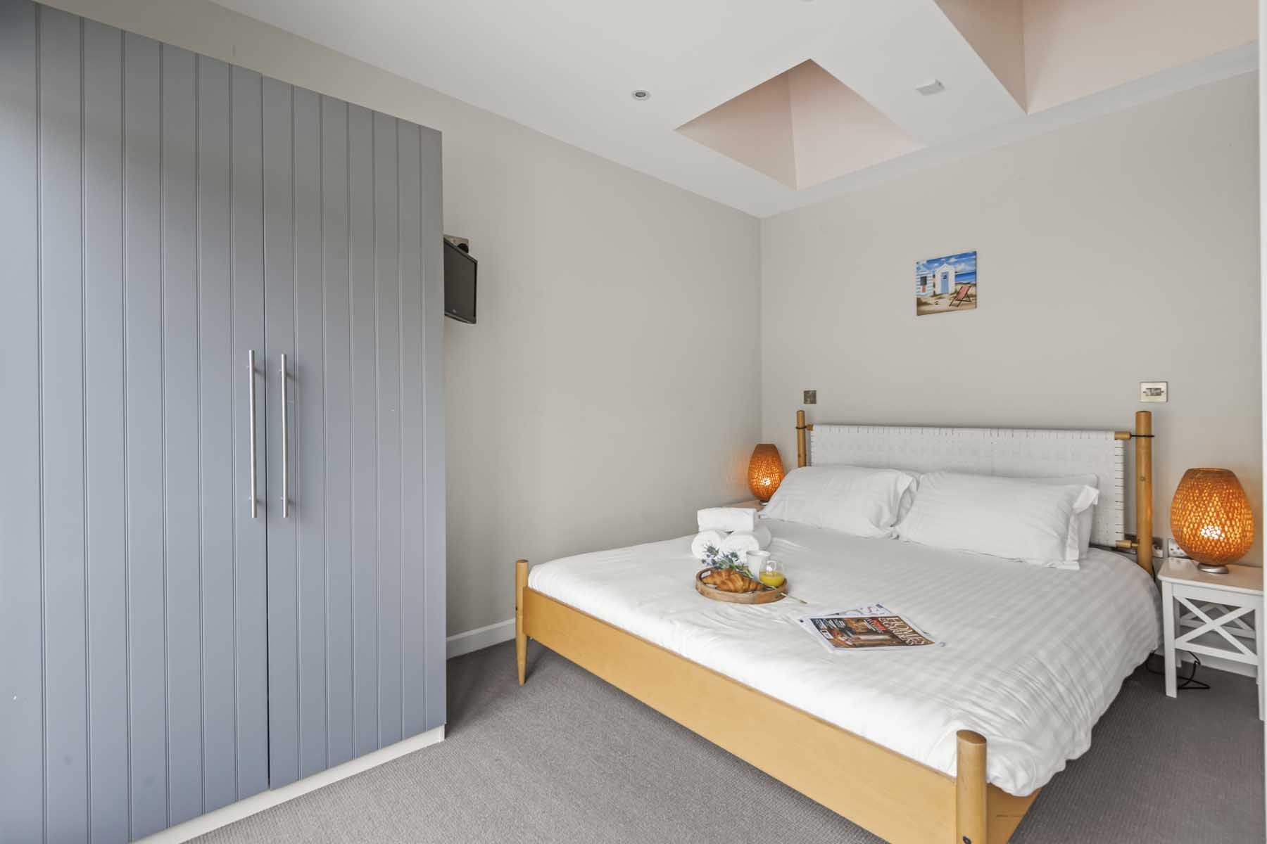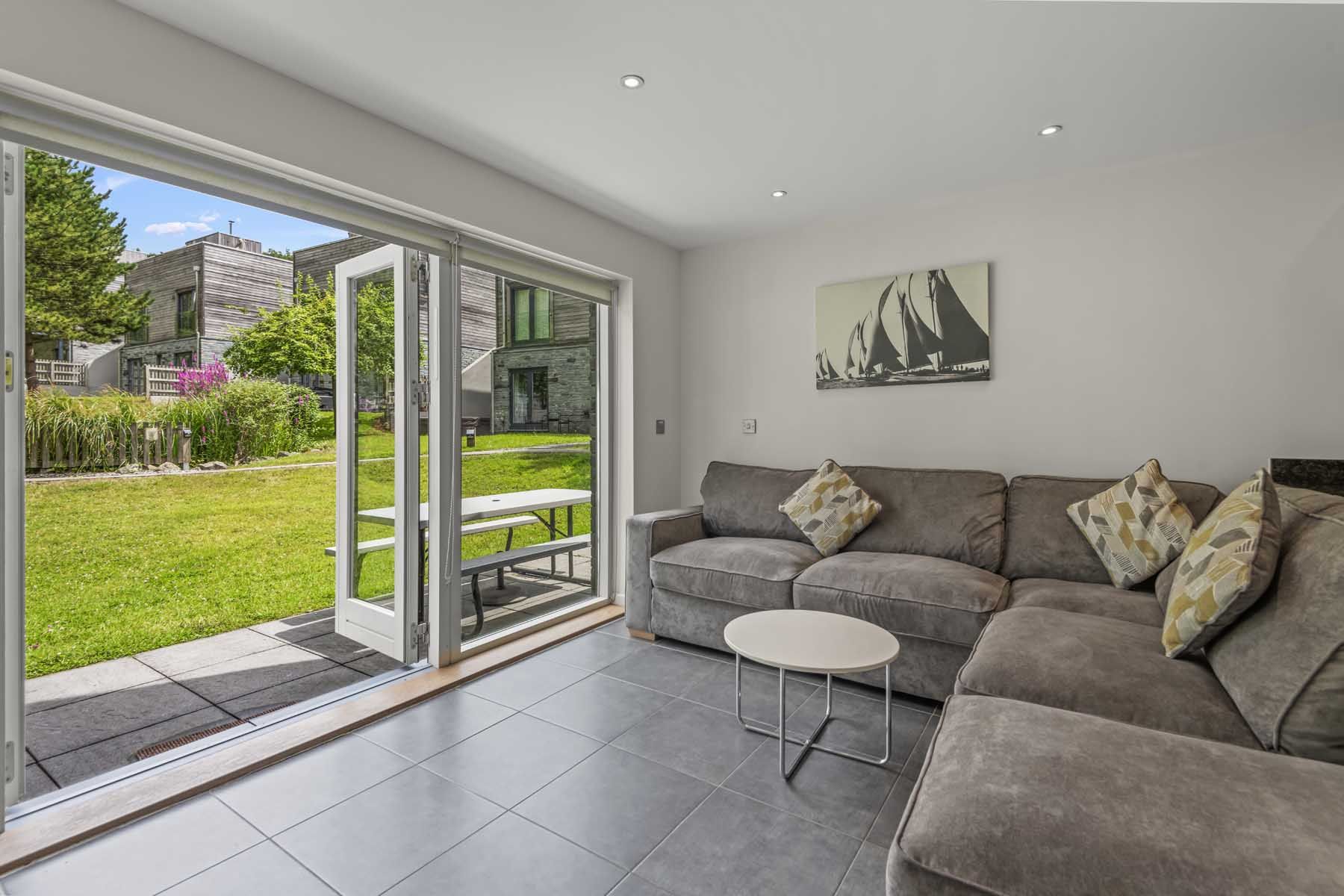 Outdoor relaxation awaits on the extensive ground-floor patio with a hot tub. Ideal for beach or pool days, the family bathroom conveniently connects to the patio.