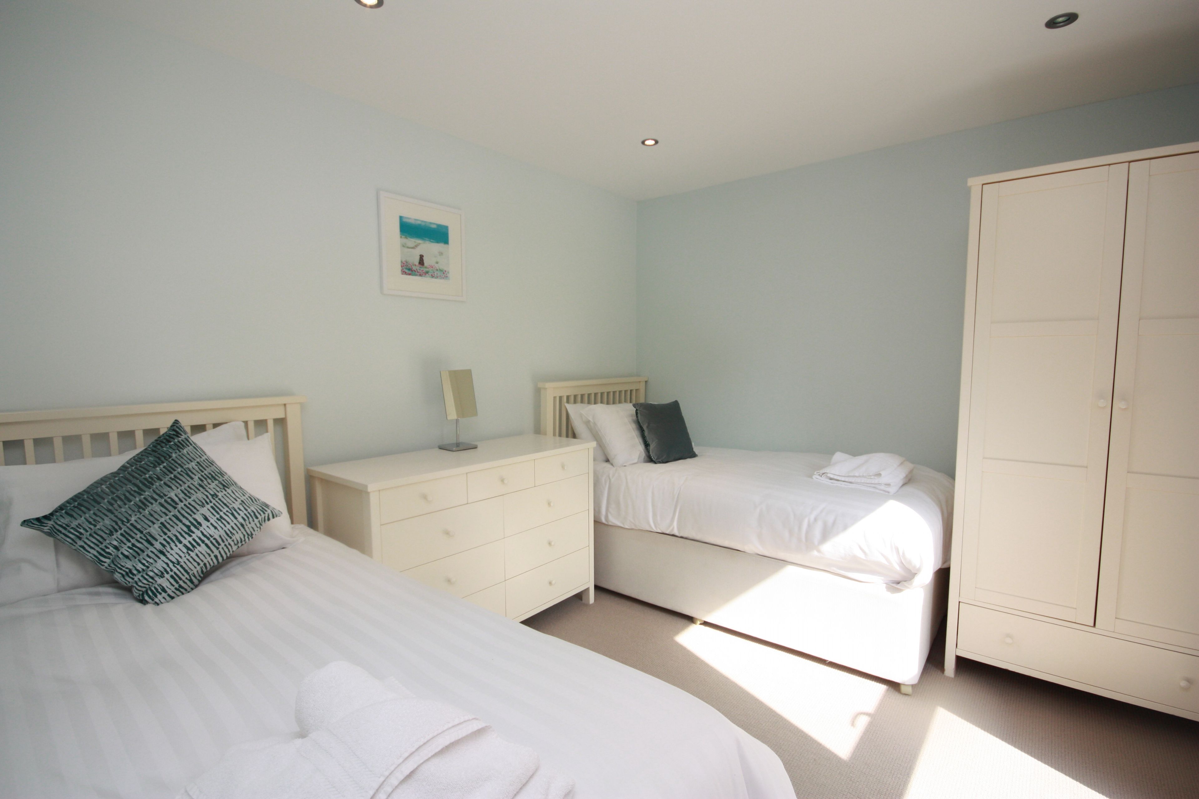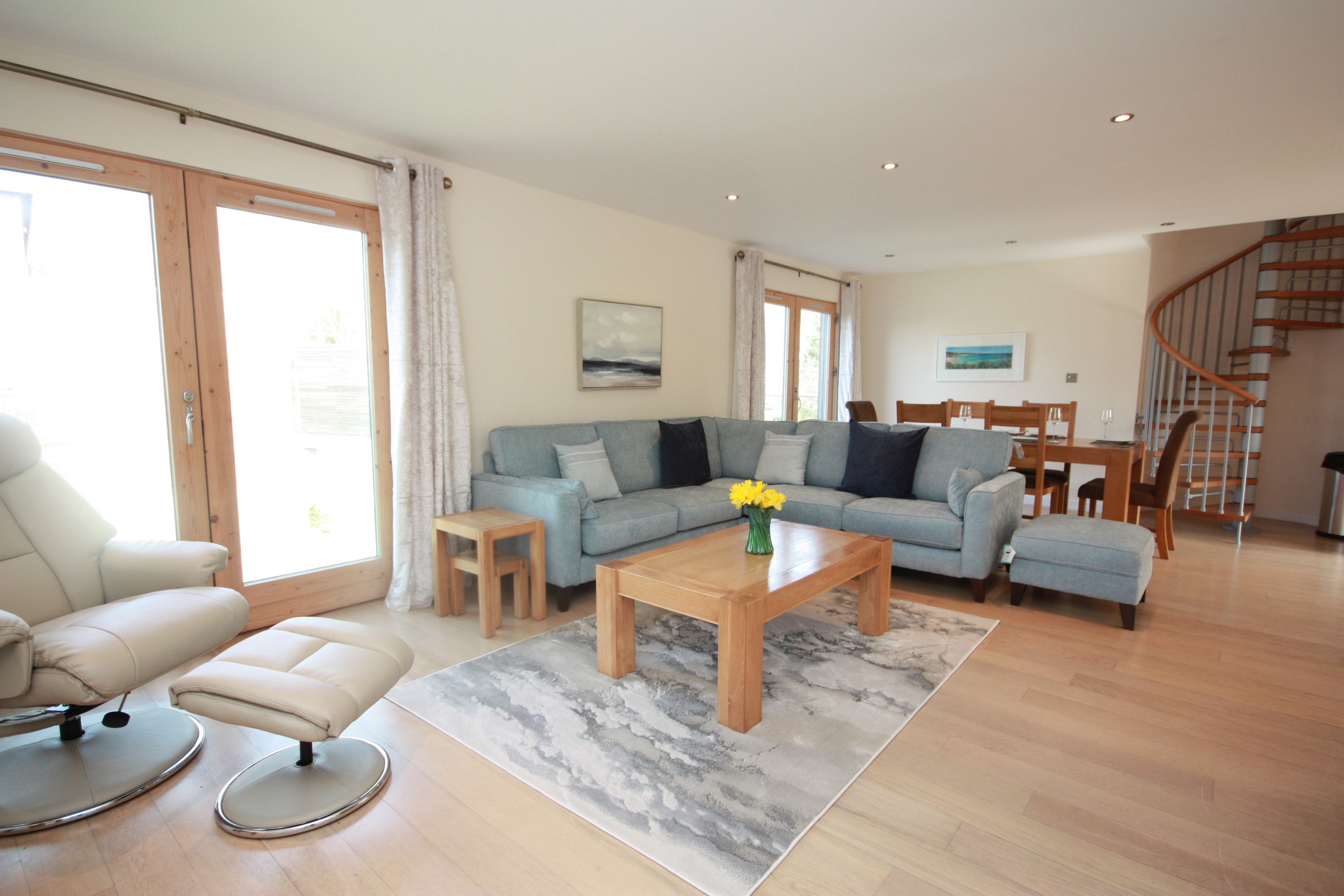 A spiral staircase from the lounge leads to the large roof area, with dining table and chairs, making it ideal for alfresco dining and having panoramic views of the countryside and the sea in the distance.