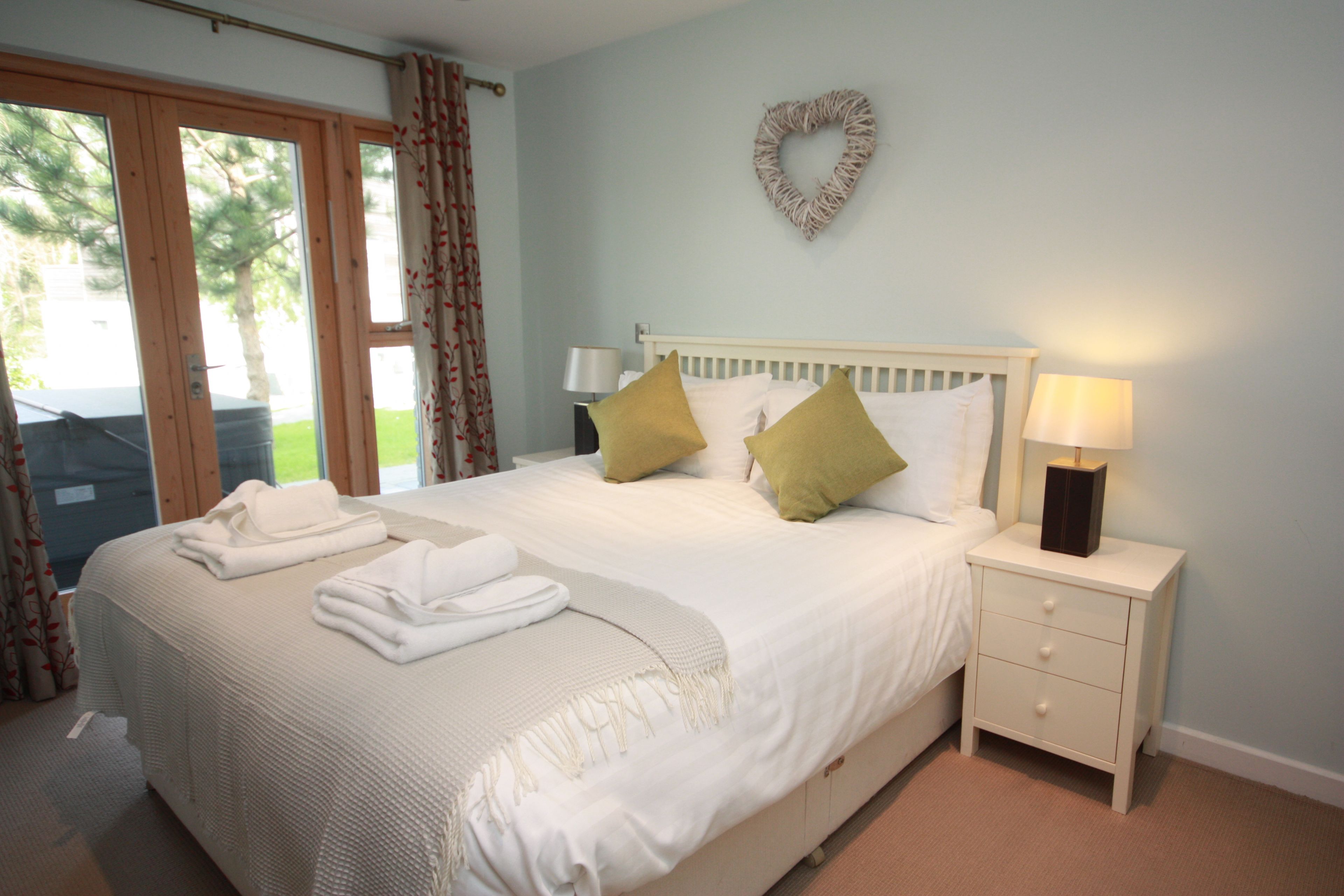 Bright and cozy bedroom with a double bed, white linens, yellow accent pillows, two bedside tables with lamps, and large glass doors letting in natural light.