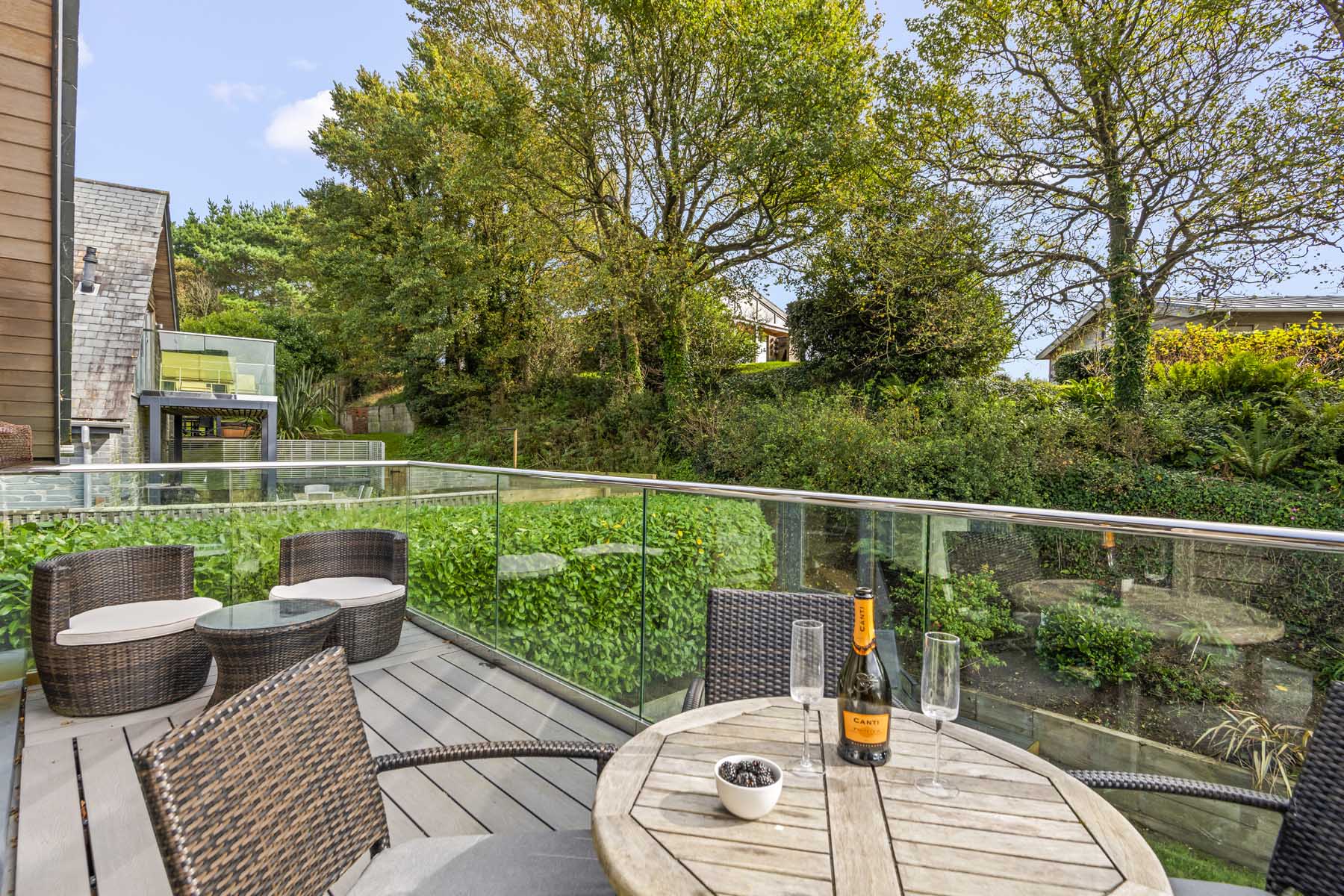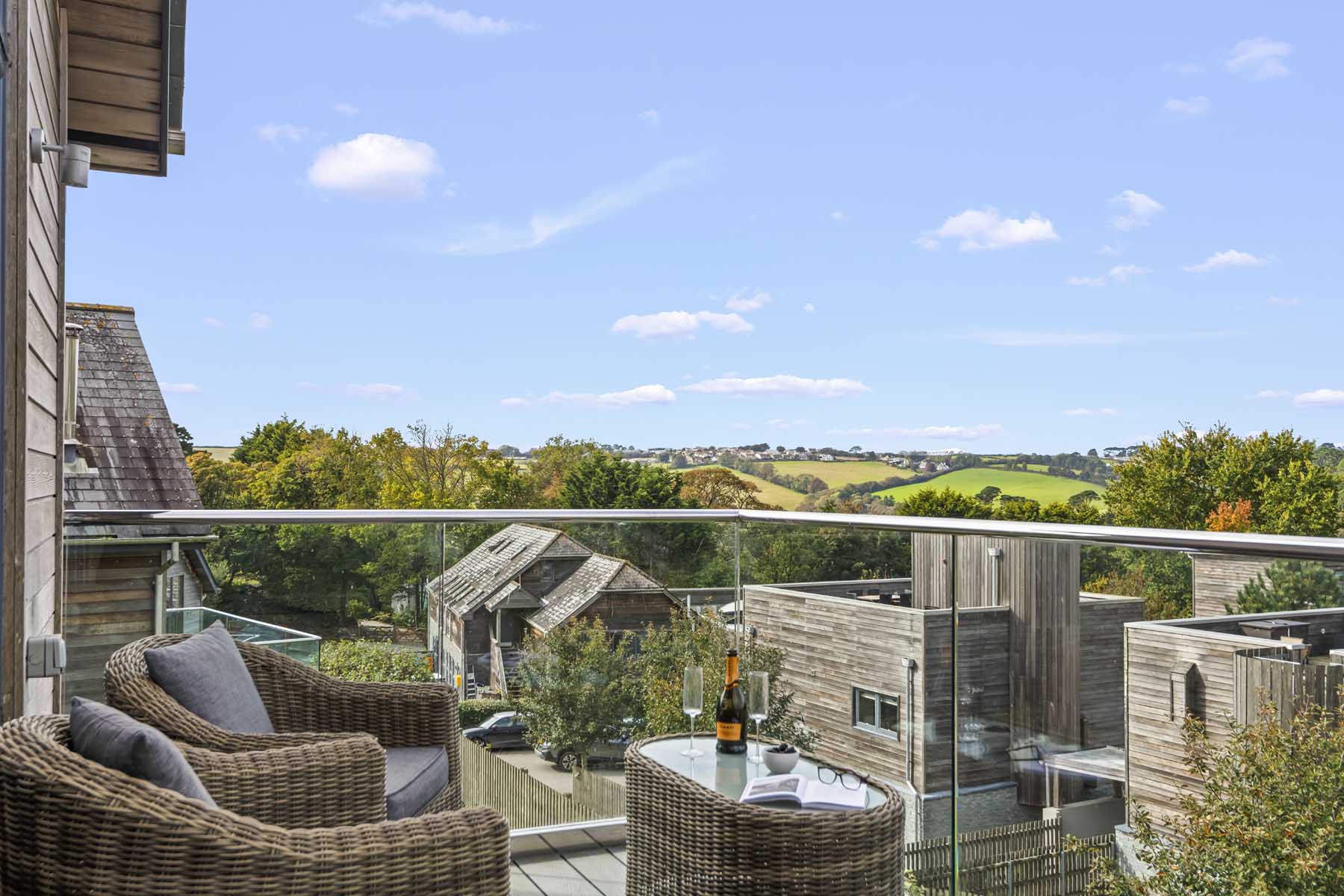 Modern balcony with wicker chairs and glass railing overlooking a countryside view with houses and green hills.