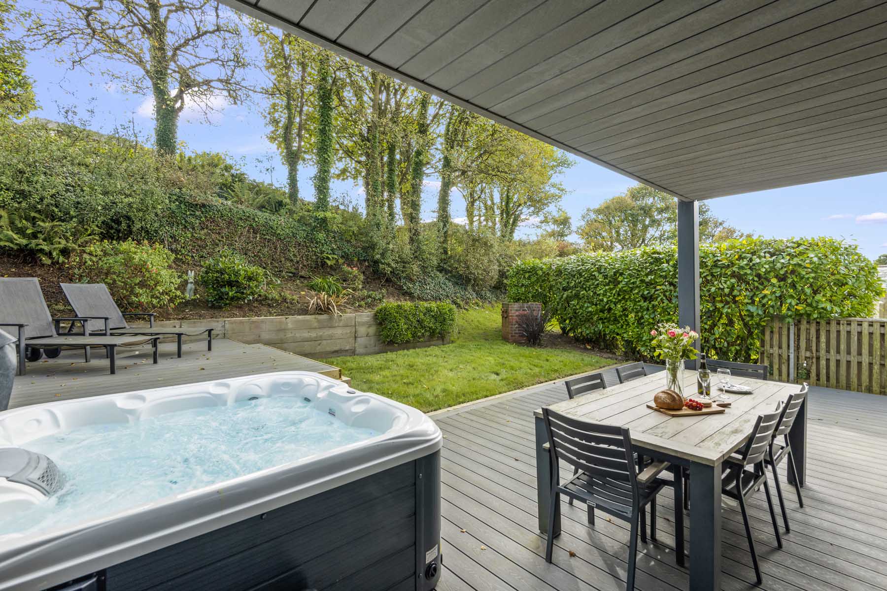 Covered patio with hot tub, outdoor dining table, and lounge chairs overlooking a green garden with trees.