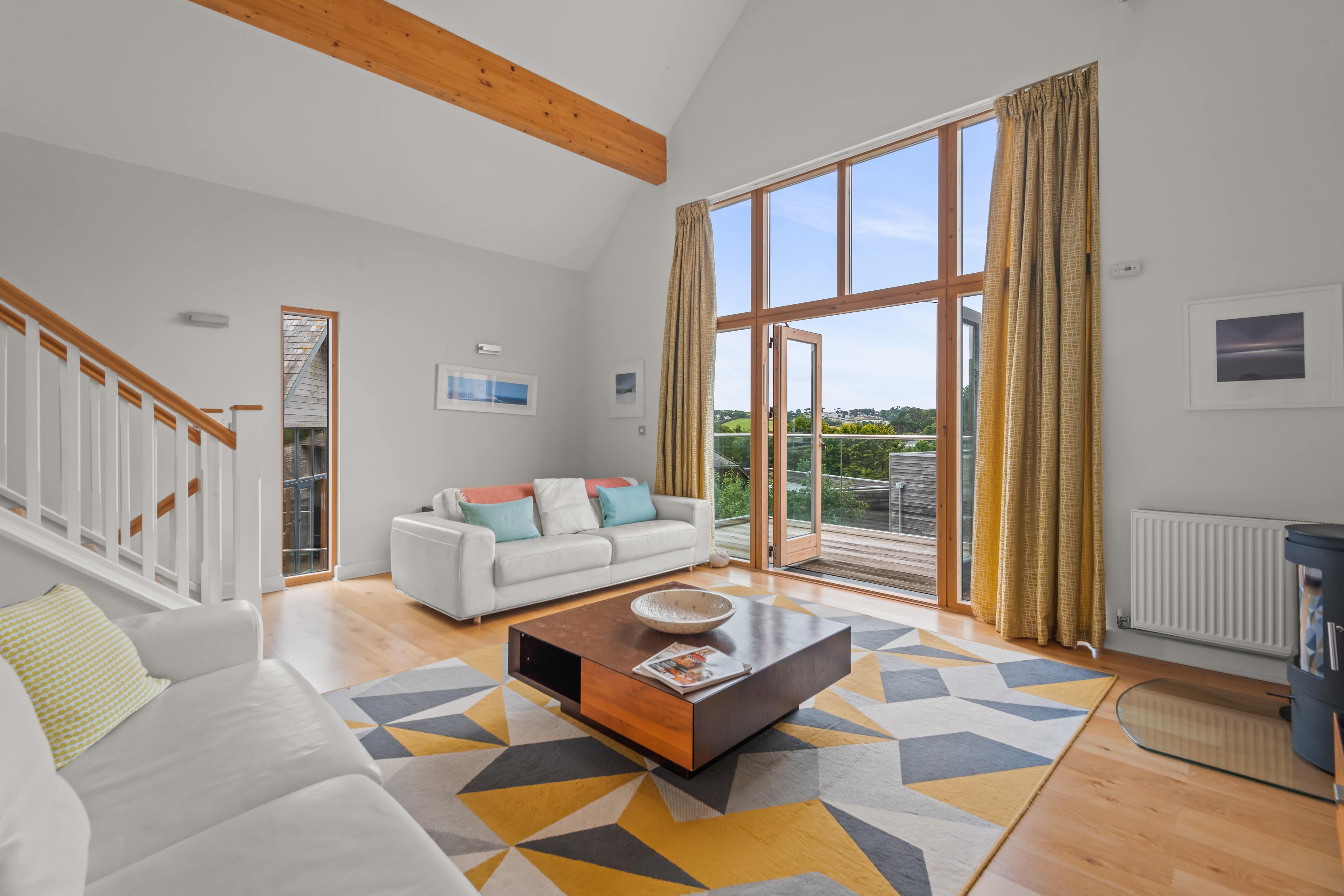 The Living room with its vaulted ceiling, huge panoramic windows/doors and full width glass balconies offers far reaching views over the development to the countryside beyond. The comfortable sofas provide plenty of seating.